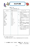 難易度:★★ 一人あたりの野菜の量:33g ワンポイントアドバイス ごぼうを多く使いますが、ごはんと一緒に炊き込むと食べやすくなります。 【 一人分の栄養価 エネルギー 364kcal 食物繊維 2.2g 塩分 0.9g 】 (施設名 つつじが丘小学校) 材 料 分量(大人2人分) 作 り 方 米 1合 ① 米は炊く30分前に洗ってザルにあげる。 ② ごぼうはささがきにして、水にさらして水気をきる。にんじんは2cmのほそ切り、干し椎茸は戻して、せん切りにする。 ③ 油揚げは油抜きしてほそ切りにする。 ④ 炊飯器に昆布と米、調味料を含めた1合の水加減、材料を入れて炊く。 ⑤ 炊き上がったら昆布を取り出し、さっくり混ぜる。いりごまをふり、茹でてせん切りにした絹さやをちらす。 ごぼう 40g にんじん 20g 干し椎茸 1枚 油揚げ 1枚 昆布 5cm しょうゆ 小さじ2 酒 小さじ1 砂糖 小さじ1 みりん 小さじ1/3 いりごま 小さじ1 絹さや 3枚 きんぴらご飯 -3-