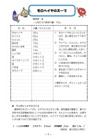 難易度:★ 一人あたりの野菜の量:75g ワンポイントアドバイス 夏野菜のモロヘイヤは、ミネラルやビタミン類、食物繊維が豊富で、夏バテ予防や生活習慣病予防としても注目の野菜です。カルシウムも含まれ、日頃不足しがちな栄養をとることができます。エジプトでは王様の野菜と呼ばれ、古くから食べられてきた野菜です。 【 一人分の栄養価 エネルギー 51kcal 食物繊維 2.2g 塩分1.3g 】 (施設名 富士見丘小学校) 材 料 分量(大人2人分) 作 り 方 モロヘイヤ 30g ① モロヘイヤは2cmくらいに切り、茎と葉を分けて下茹でする。 ② キャベツ、にんじん、たけのこは千切り、長ねぎは小口切りにする。春雨は戻しておく。 ③ スープににんじんを加え、たけのこ、春雨、キャベツの順に入れる。 ④ ごま油以外の調味料を加え、味つけする。 ⑤ 長ねぎと下茹でしたモロヘイヤを加える ⑥ 最後に、ごま油を入れる。 *春雨も入り、ボリュームたっぷりのスープです。 キャベツ 60g にんじん 25g 長ねぎ 15g たけのこ水煮 15g 春雨 14g しょうゆ 小さじ1 酒 小さじ1/2 オイスターソース 小さじ1/2 塩 小さじ1/4 ごま油 小さじ1/2 ガラスープ 450cc モロヘイヤのスープ -7-