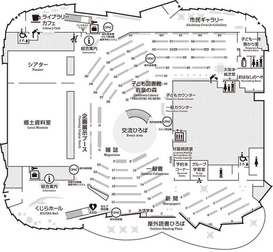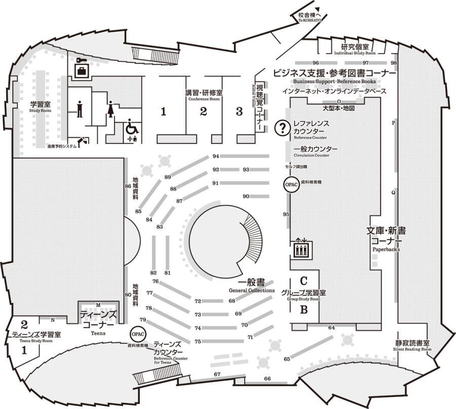 蔵書規模は約40万冊。セルフ貸出機、読書の記録機、自動化書庫などの設備を備え、グループや個人で利用できる学習室も多数設置。 - 屋外読書ひろば
