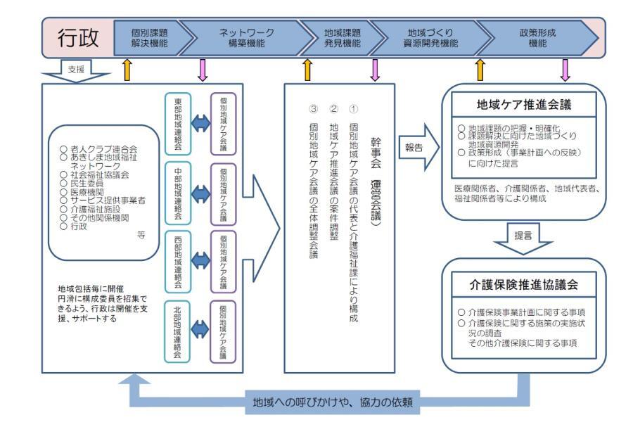 地域ケア会議は、地域包括ケアシステムを深化・推進するにあたり、多職種が協働し「個別課題の解決」「地域包括支援ネットワークの構築」「地域課題の発見」「地域づくり・資源開発」「政策の形成」の5つの機能により、適切な支援を図るために必要な検討を行うとともに、地域において自立した日常生活を営むために必要な支援体制に関する検討を行うものです。