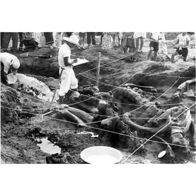 - 昭和36(1961)年当時の技術や用具で、たった一週間ばかりで発掘されたあと、剖出、組み立て、保存作業が計画的に根気よく行われました